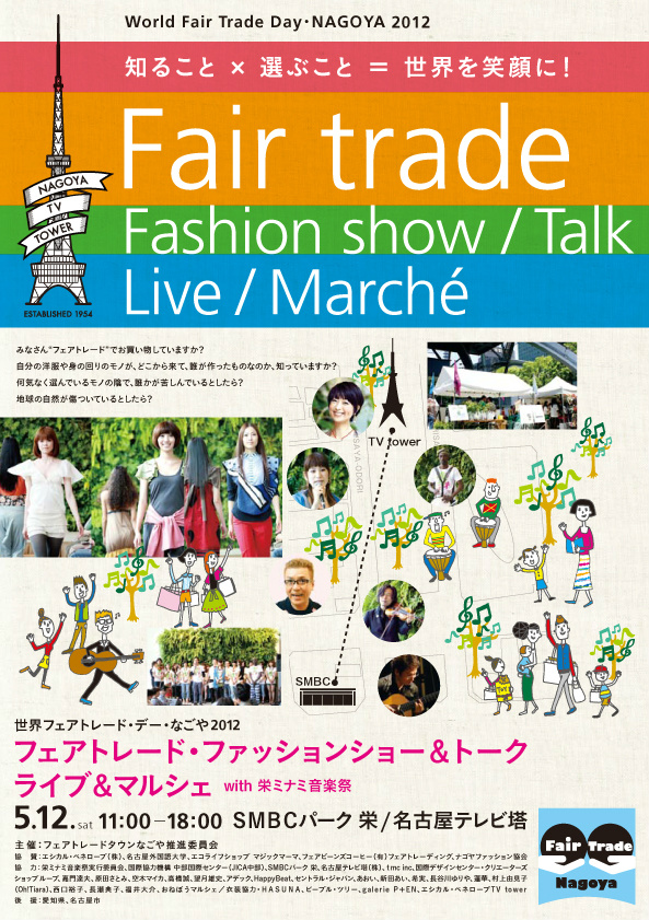フェアトレードファッションショー&トーク&ライブ&マルシェ 今年も世界フェアトレードデイにテレビ塔でイベントを行います みなさん気軽にお越しくださいね ・・・ ゲリラBeat It!もあります。(^_^)v [ 日程 ] 5月12日(土) [ 時間 ] 11時00分~18時00分 [ 会場 ] 名古屋テレビ塔&SMBCパーク栄 [ 会場HP ] http://www.nagoya-tv-tower.co.jp/ [ 内容 ] ワークショップ 商品の販売 試飲・試食・体験 ファッションショー その他 [ 参加 ] 無料、定員無制限、申込み不要 [ 会場住所 ] 名古屋市中区錦三丁目6-15 http://www.geocities.jp/fair_trade_town/event 世界フェアトレード・デーとは・・ WFTO(World Fair Trade Organization)に加盟する、世界75ヶ国・約450団体のフェアトレード組織と生産者組織が一斉にフェアトレードをアピールする日。毎年5月の第2土曜日に、各国でイベントやキャンペーンを同時開催。1995年にヨーロッパのフェアトレード・ショップの連合が運動を開始。世界一斉実施は、今年で11回目。 PR |